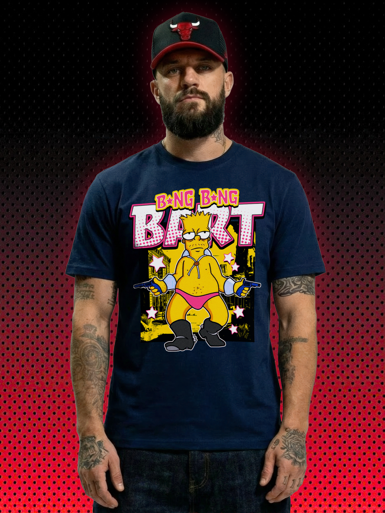 Massives Front- & Backprint-Design Hinten dominiert der King selbst: Bart im knalligen Gelb-Look, pinker Slip, Handschellen-Ärmel, zwei Pistolen im Double-Grip-Pose und darüber der explosive Schriftzug BANG BANG BART in knalligem 90er-Pink-Gelb mit Halbton-Dot-Effekt. Vorne dezent oder clean – je nach Variante. Perfekt für alle, die Statement-Shirts lieben, die sofort ins Auge fallen.