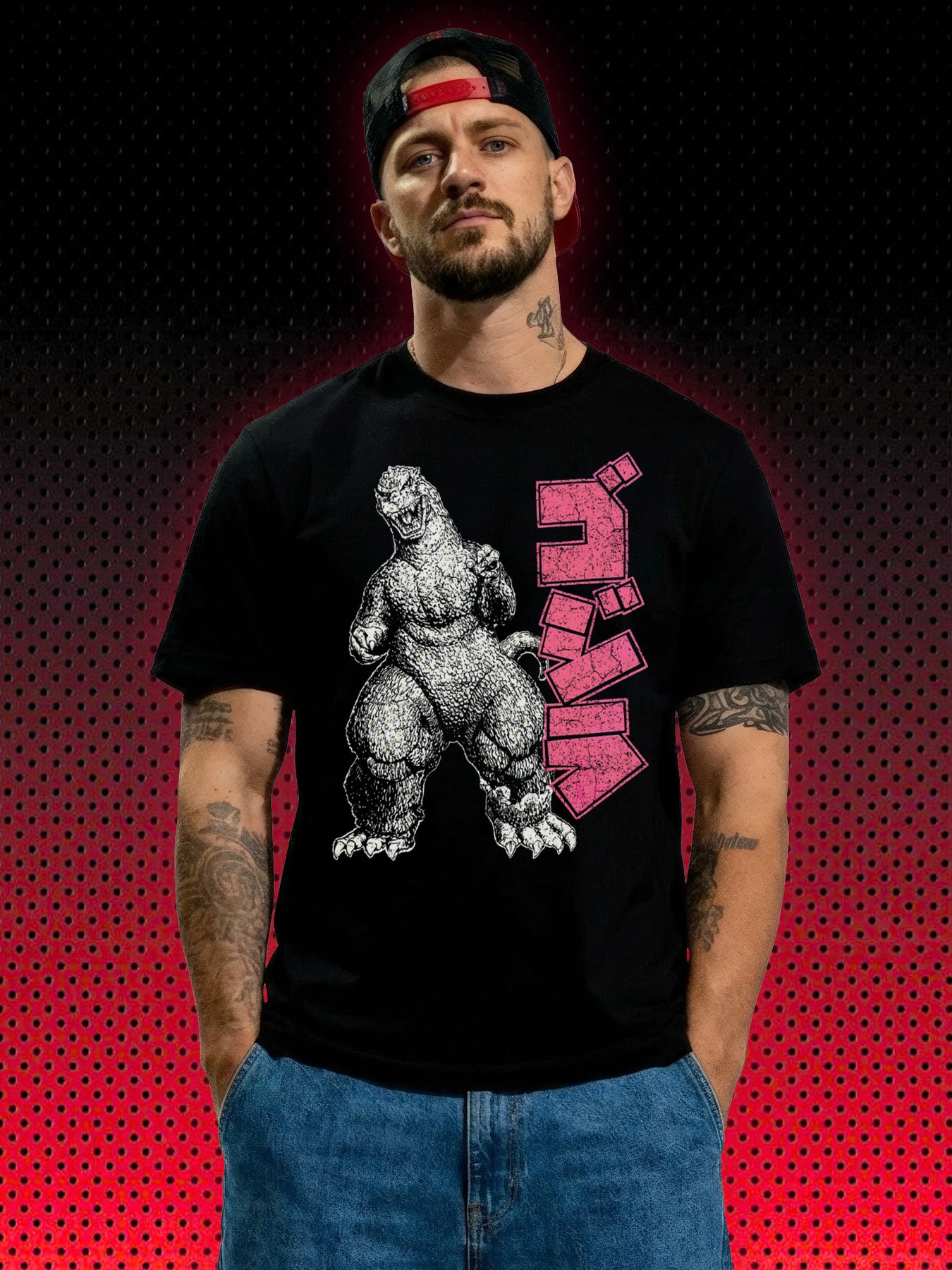 Godzilla steht breit, schwer, unaufhaltsam. Jeder Muskel wirkt wie Beton, jede Klaue wie ein Abrisswerkzeug. Die japanische Typografie schreit nicht – sie droht. Schwarz auf Schwarz, roh, brutal, kompromisslos. Dieses Motiv funktioniert nicht über Nostalgie, sondern über Präsenz. Es sagt klar: Ich bin größer als dein Chaos.